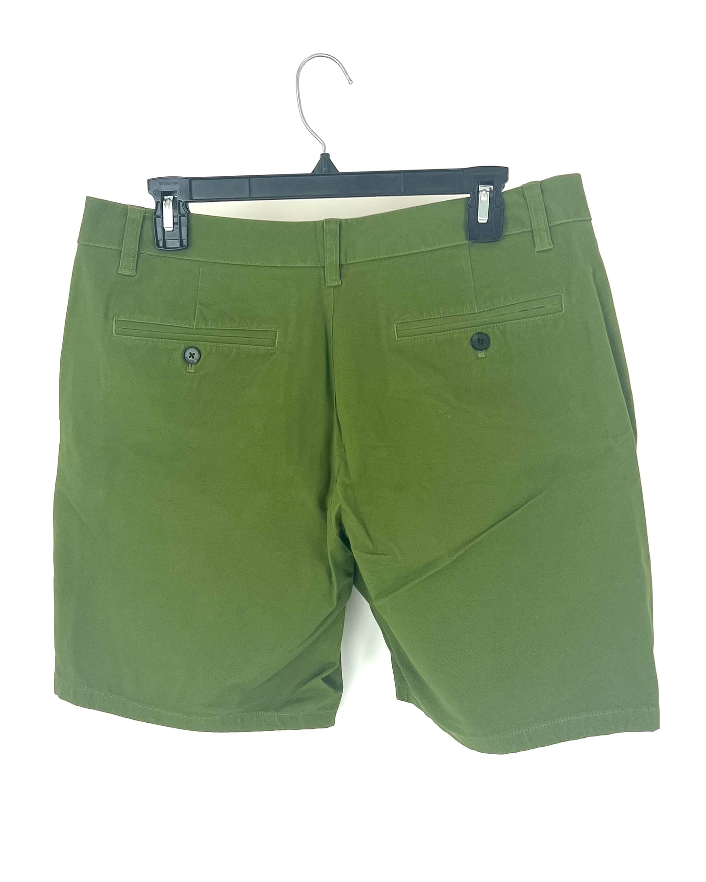 MENS Bonobos deep forest green shorts with a zipper and button closure, side pockets, one side zipper pocket, back pockets with a button closure, belt loops, and a blue floral interior lining