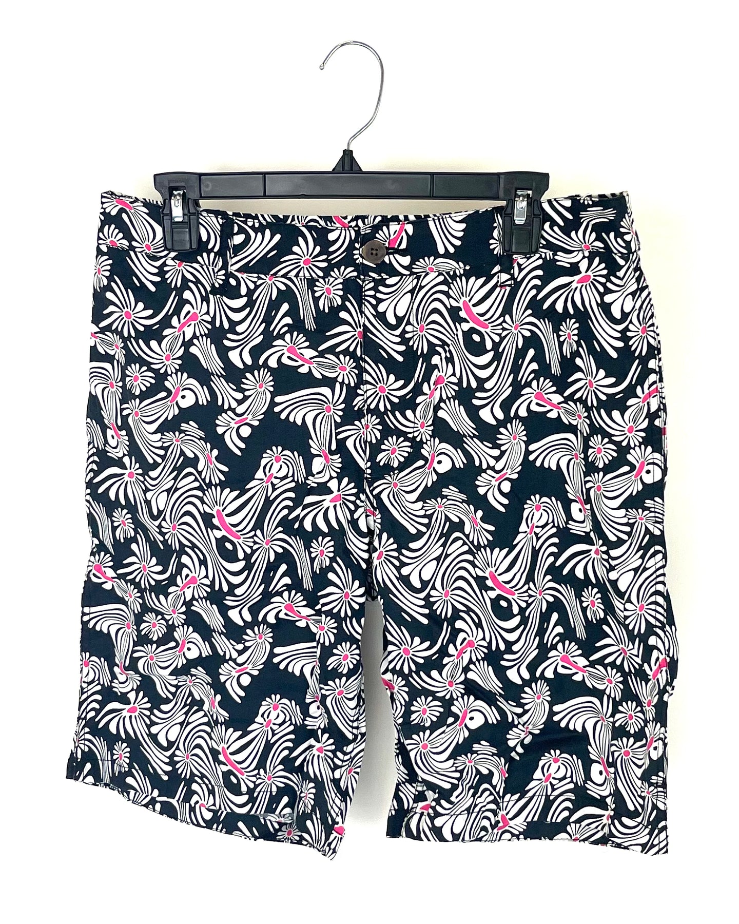 Bonobos black shorts with pink and white distorted flower pattern, front and back pockets, belt loops, and elastic waistband