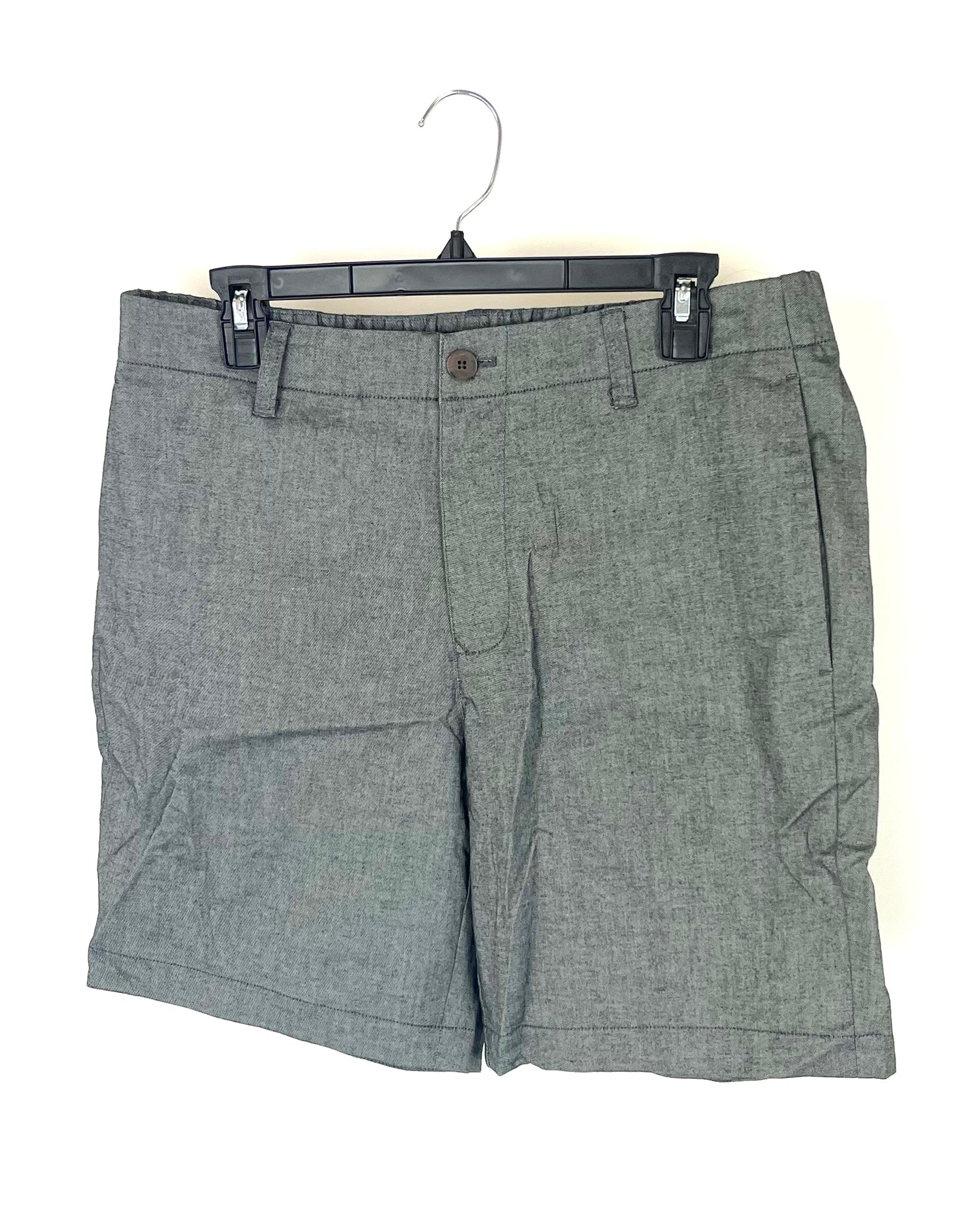 MENS Bonobos light charcoal shorts with a zipper and button closure, side pockets, back pockets, belt loops, stretchy elastic back waistband, and a light blue interior lining
