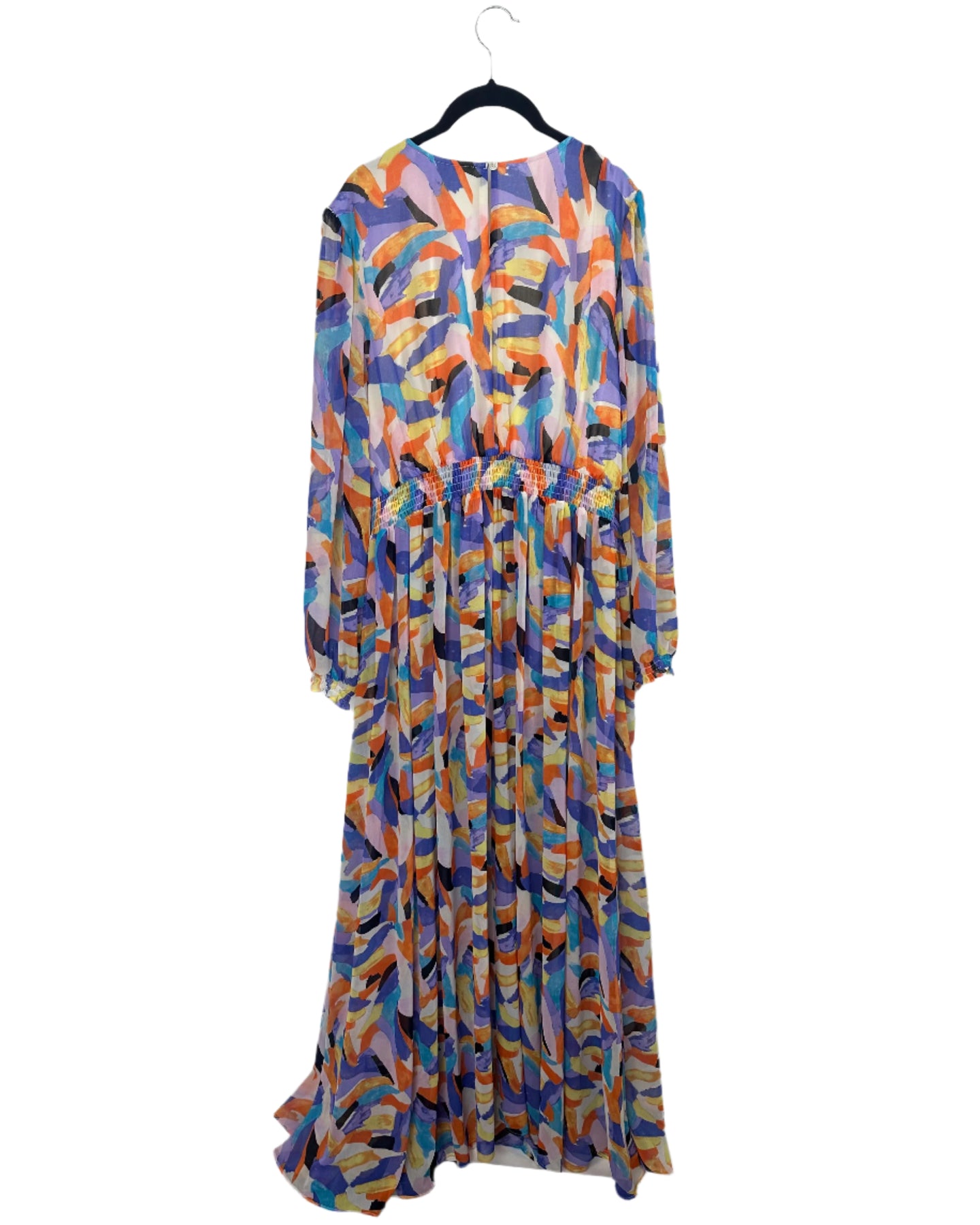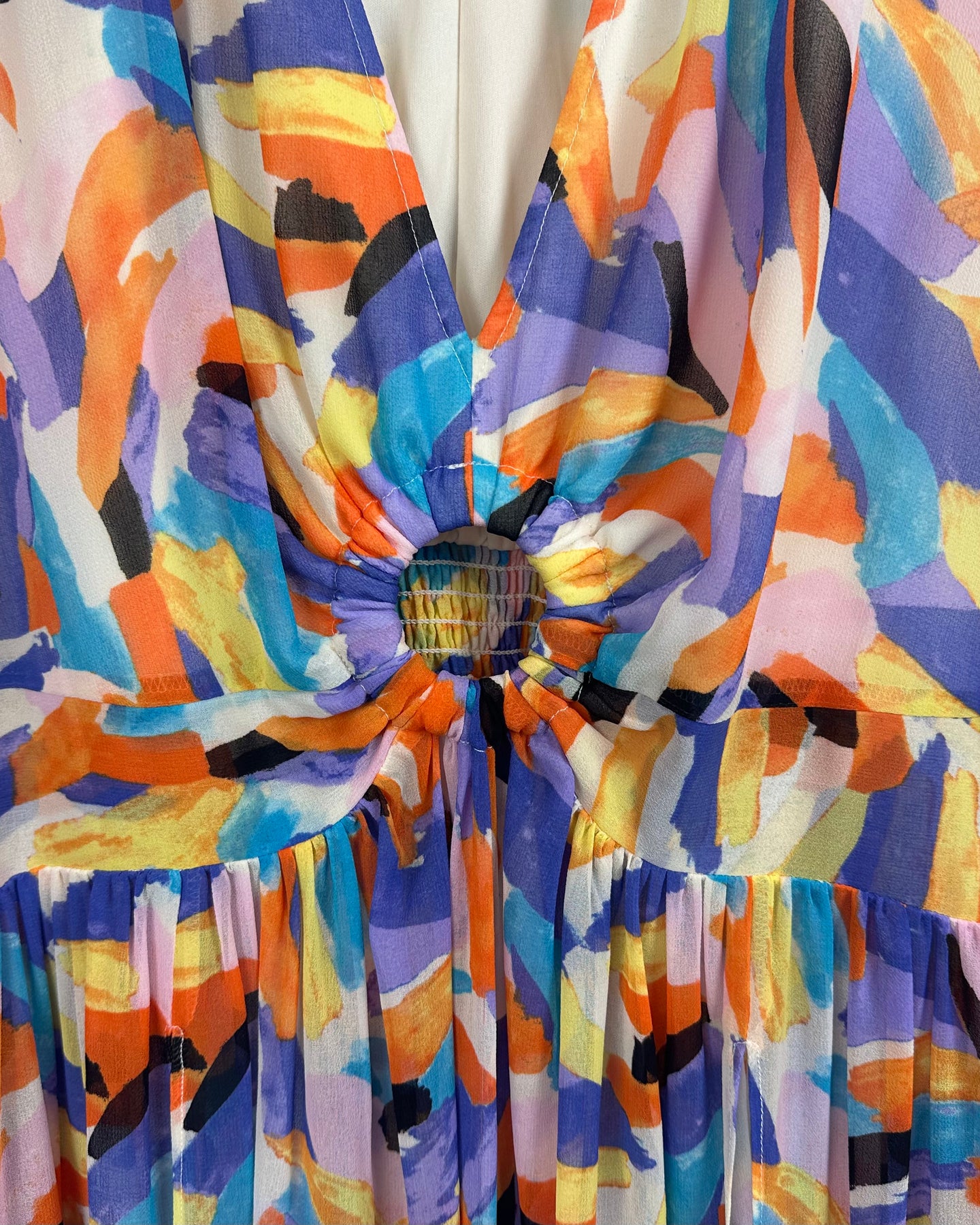 Nina Parker multicolor abstract dress with bubble sleeves, a v-neckline, a ring detailed cutout in the front, and a side slit, made in a stretchy lightweight fabric