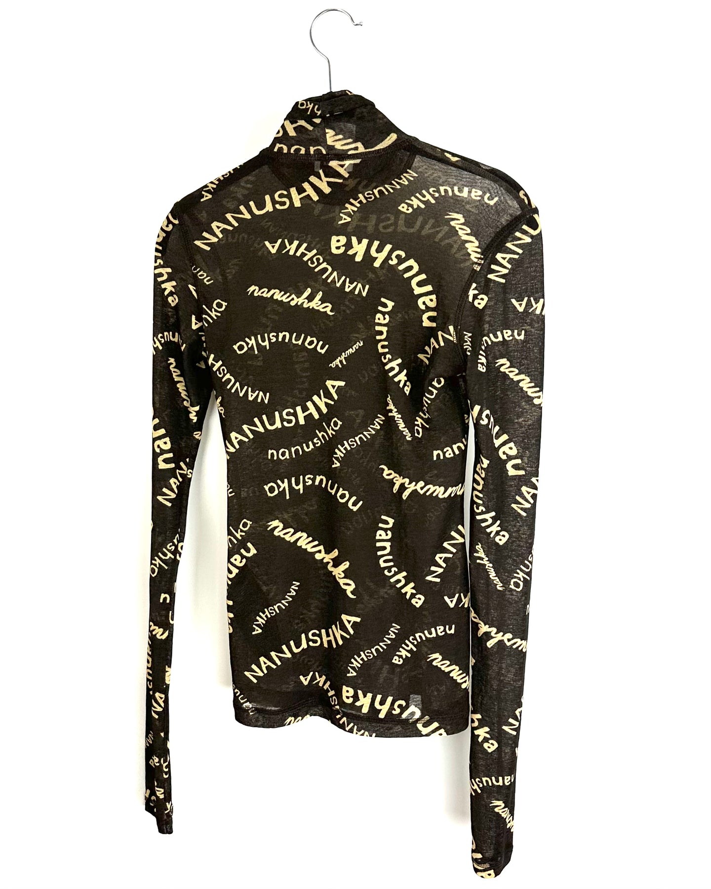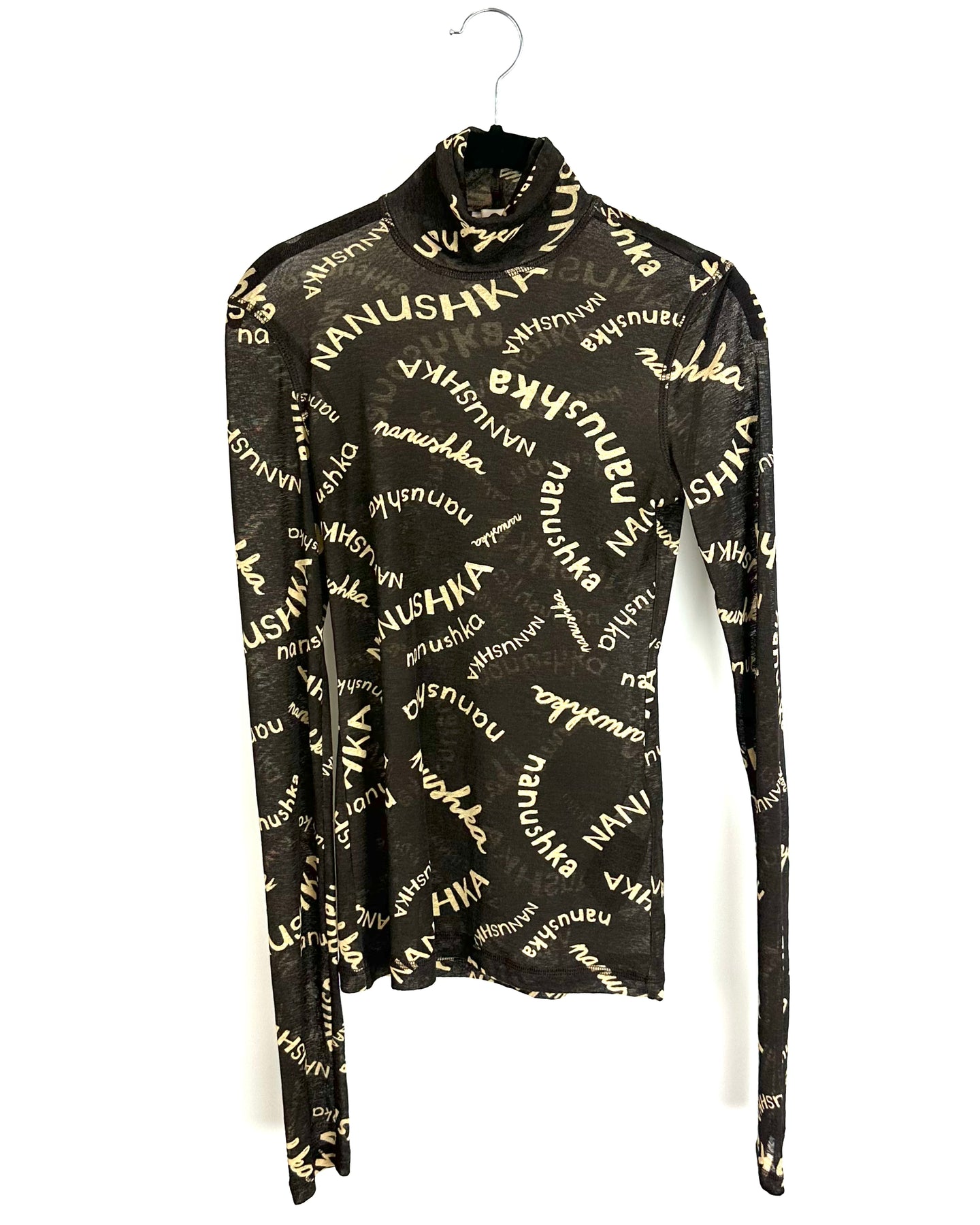 Nanushka brown sheer turtle neck long sleeve top with "Nanushka" written all over the shirt