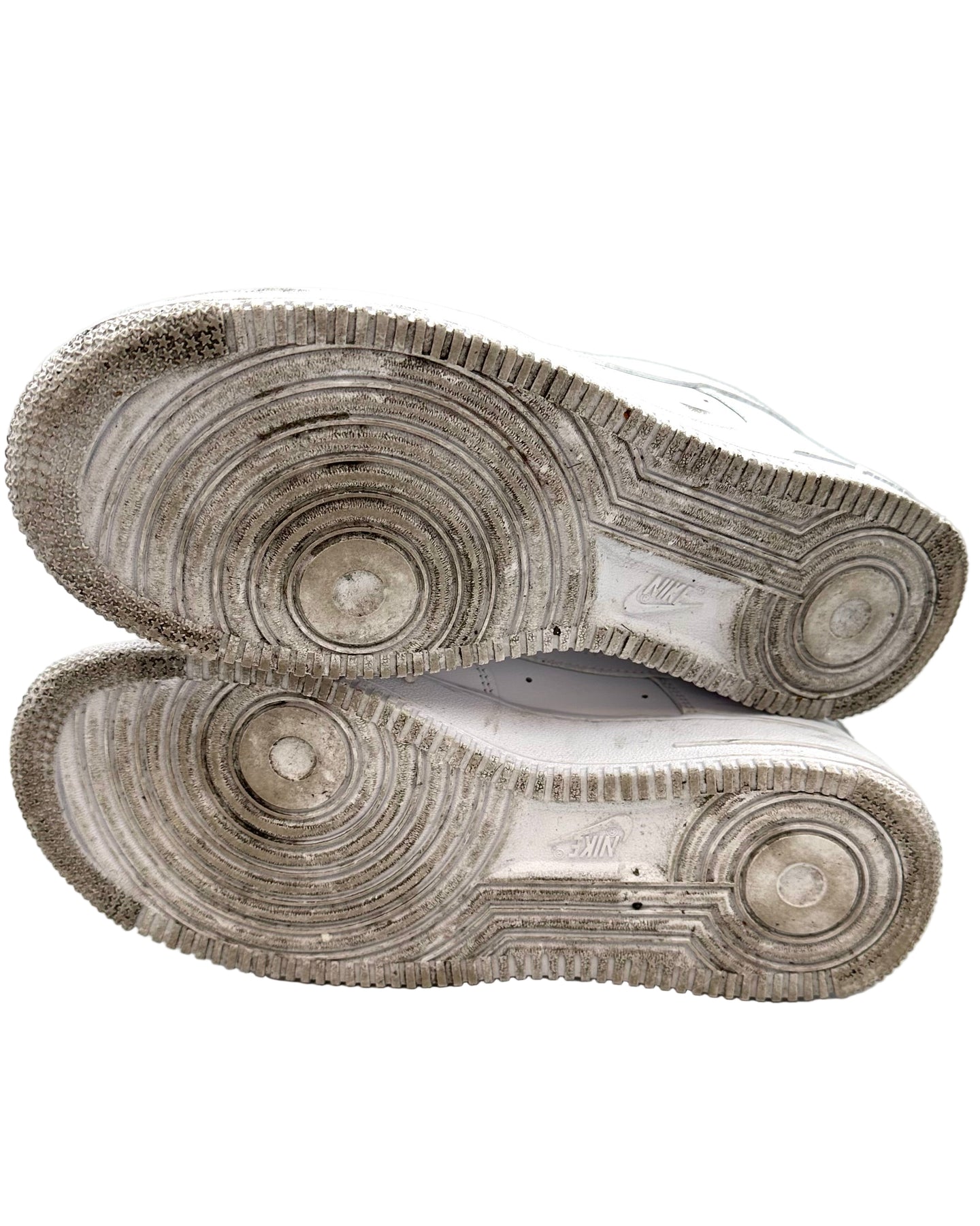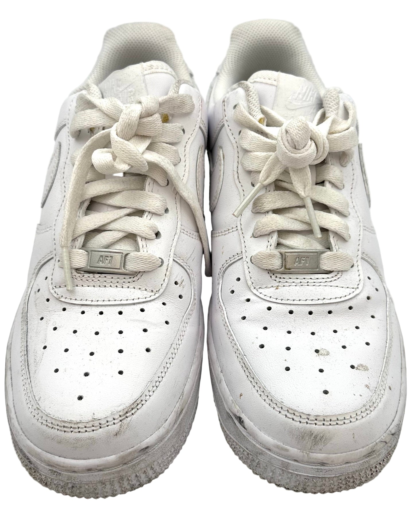 Nike Air Force 1 white sneakers with the Nike check logo on both sides, perforated details on the toe box, white laces, a silver "AF1" logo laced on the front, gold writing on the back, and a gold design on the right shoe. These sneakers are used and have worn soles and various scuffs and marks on them.
