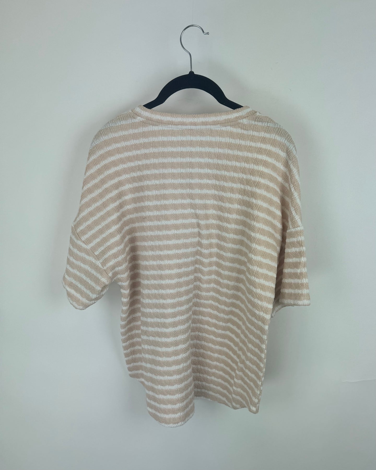 Light pink and white striped button down top with short sleeves , made in a soft and stretchy fabric