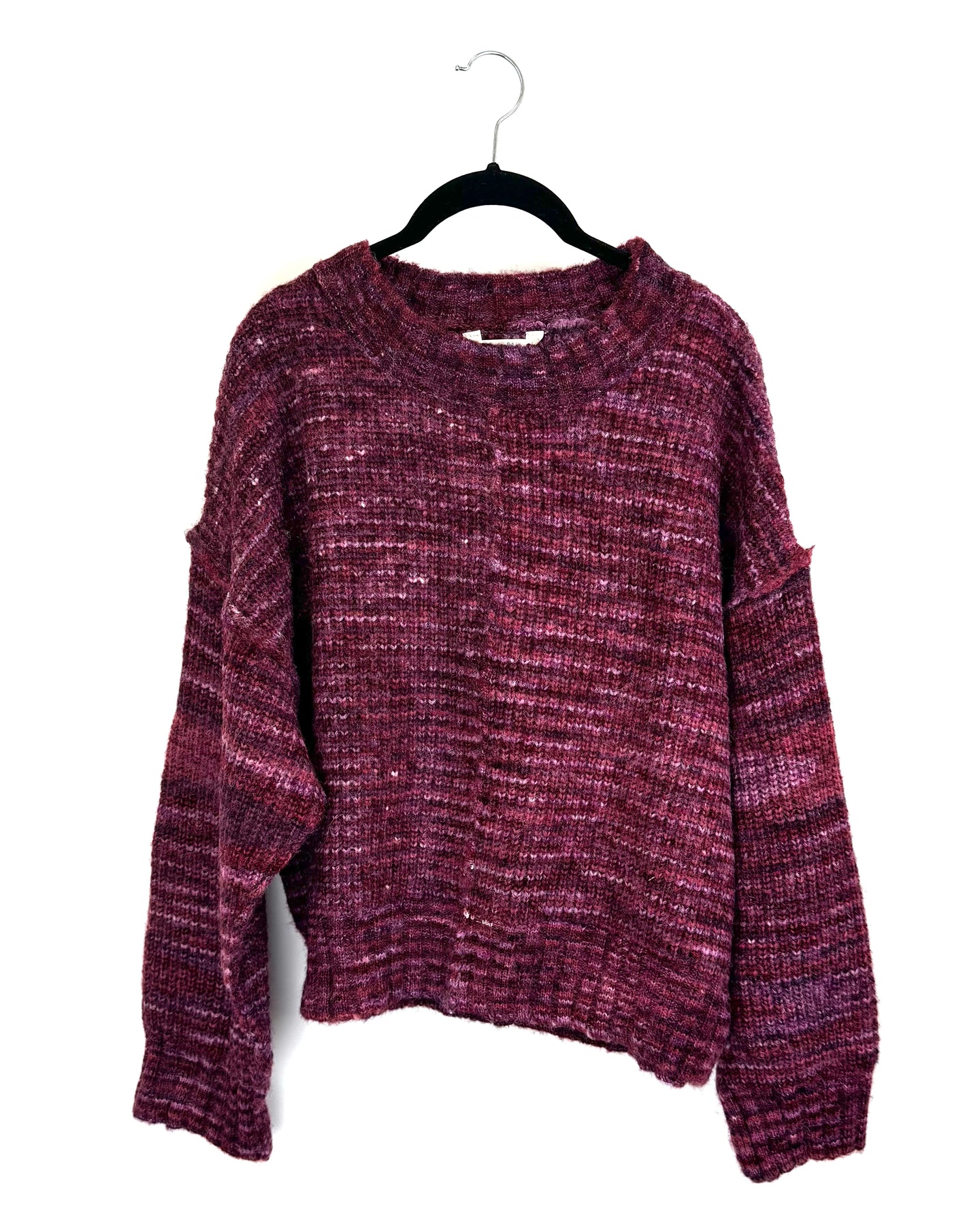 Reunited Clothing Purple distressed knit sweater with subtle specks of lighter tones and raw-edge distressed shoulder seams