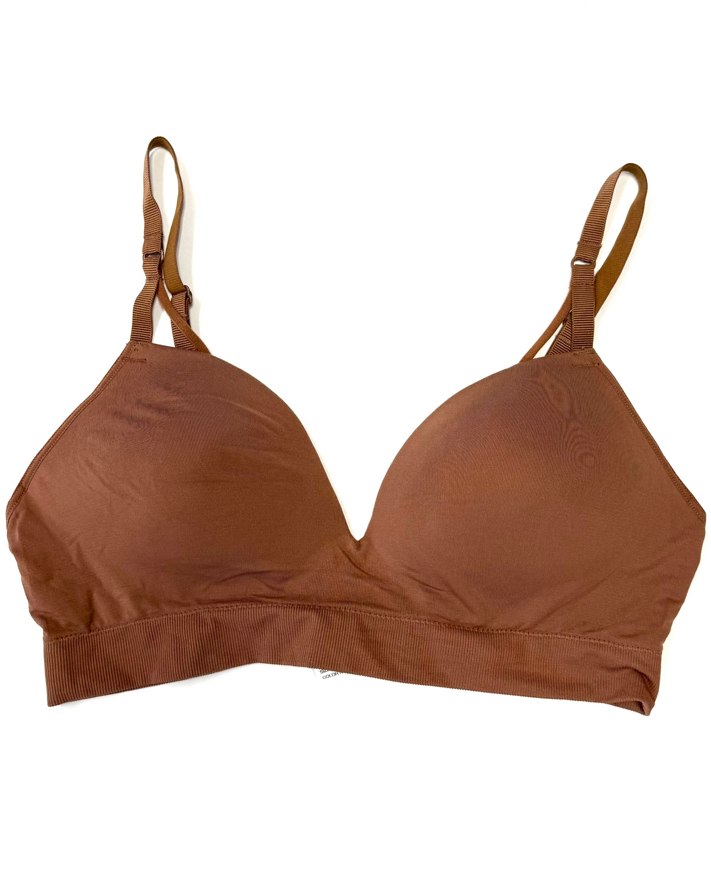 Russet brown wireless padded plunge bra with adjustable straps and adjustable back closure
