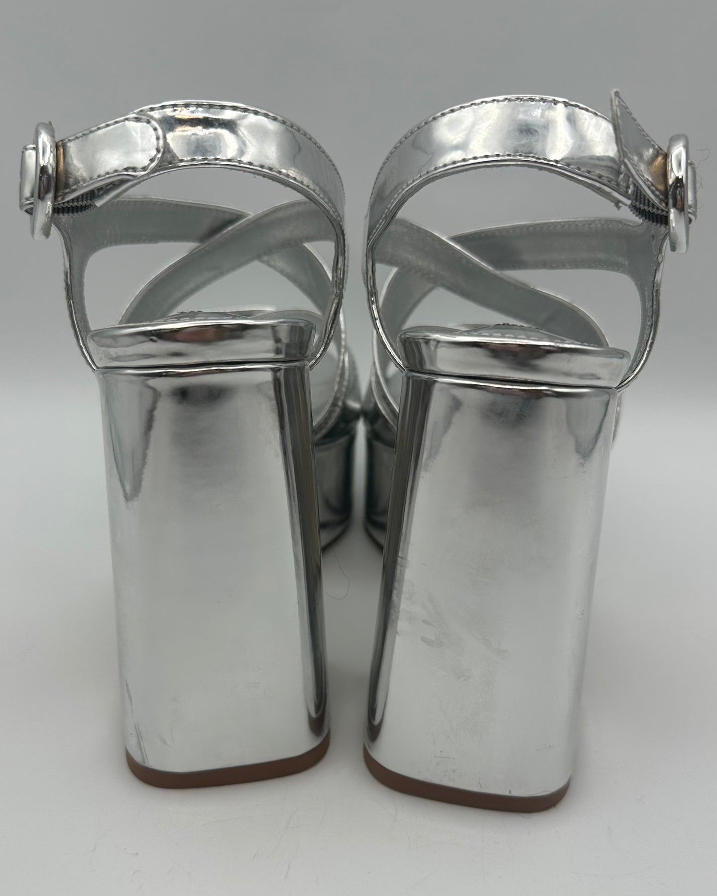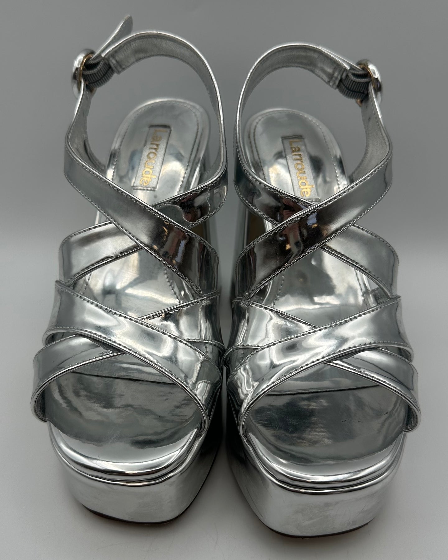 Larroudé silver patent leather platform sandals with a top strappy detail and adjustable ankle buckle. Please note the metallic leather has discoloration to the coating but these shoes are brand new with slight scuff marks to the soles most likely from photoshoots.