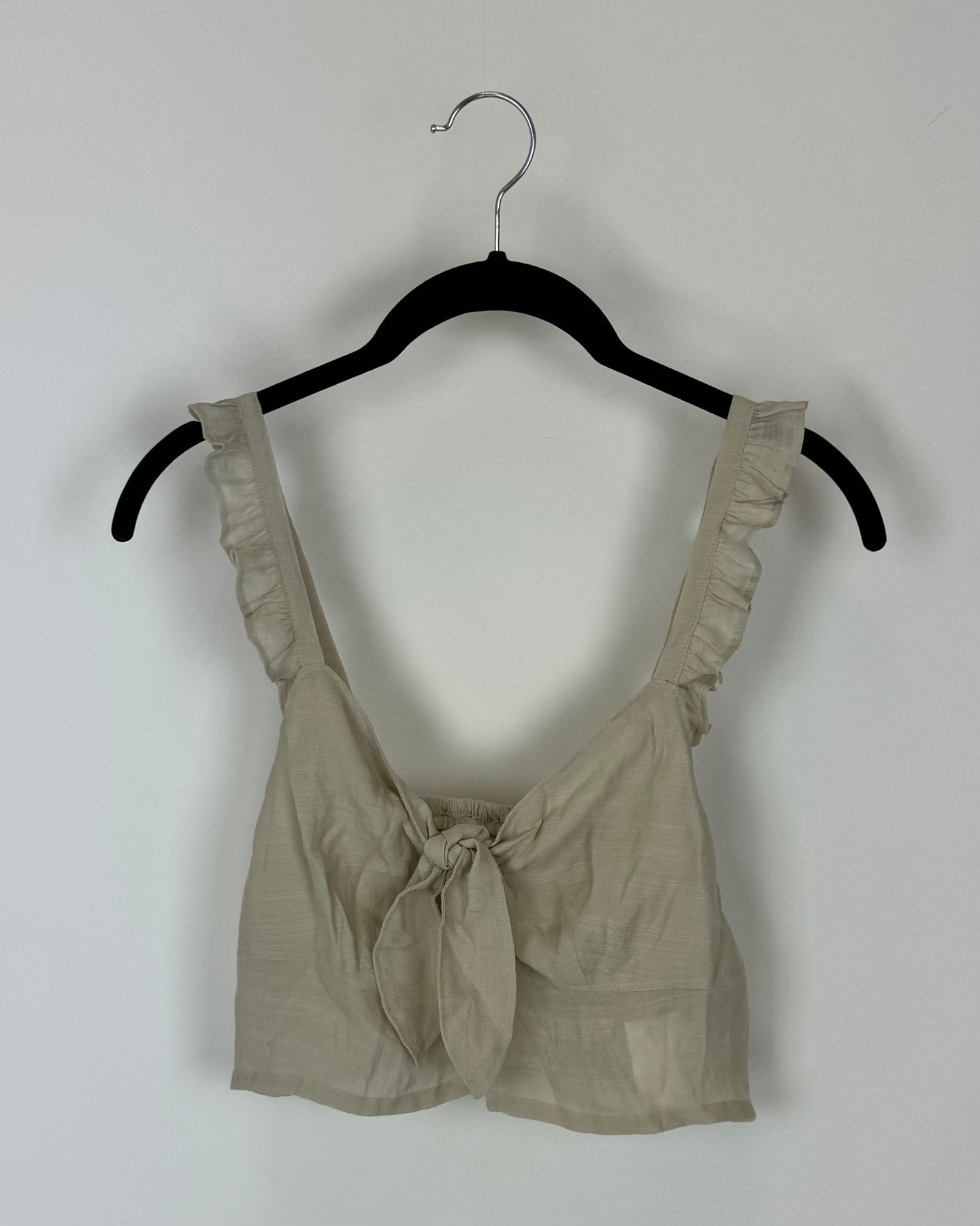 Tan Cropped Tank Top, front tie fabric ruffle shoulders, with stretchy smocked back