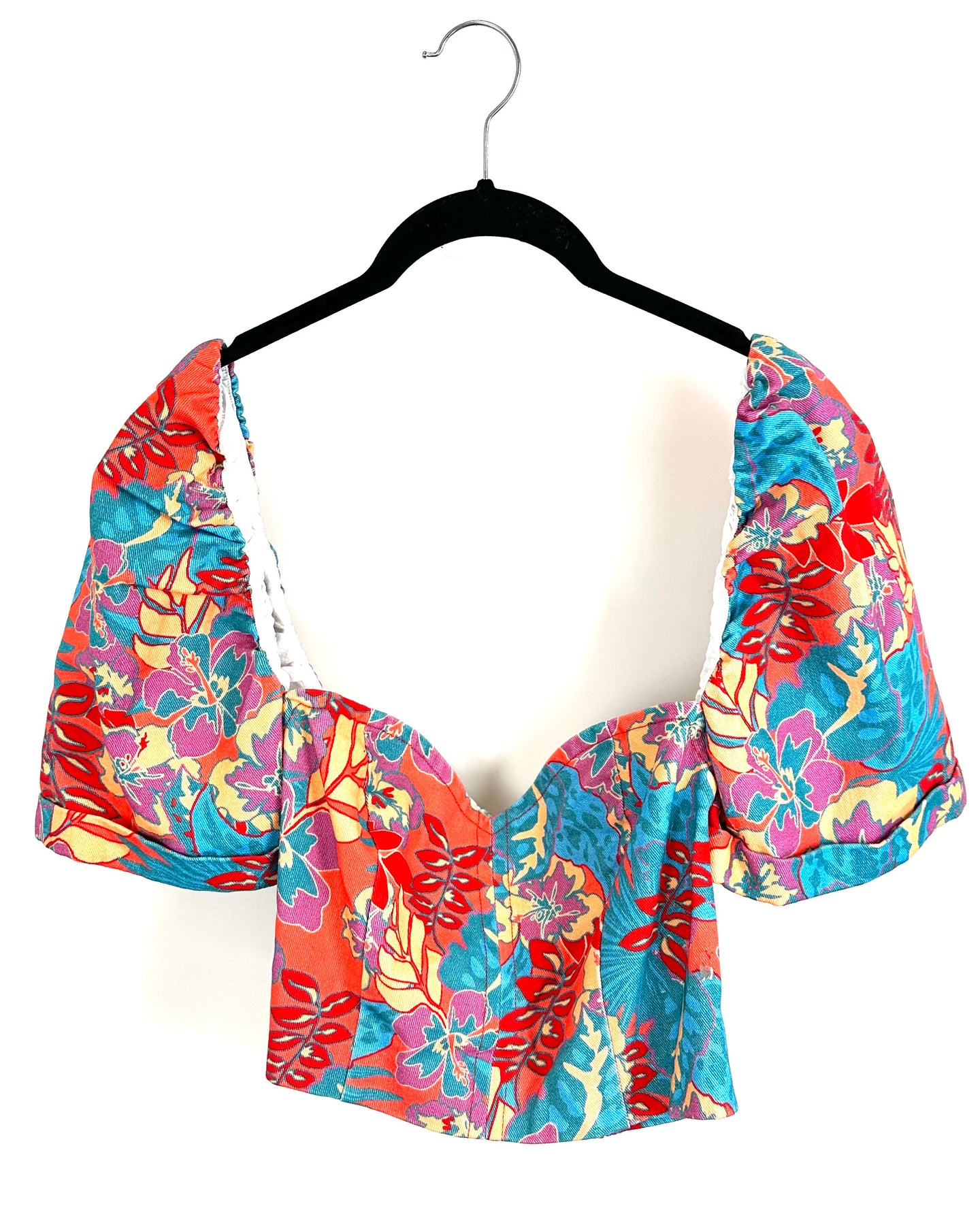 Reunited Clothing crop top in a structured, lined material with a red, orange, blue, and purple tropical pattern, a sweetheart neckline, red stitching details, a smocked, stretchy panel on the back, and large puffed short sleeves with a foldover hem