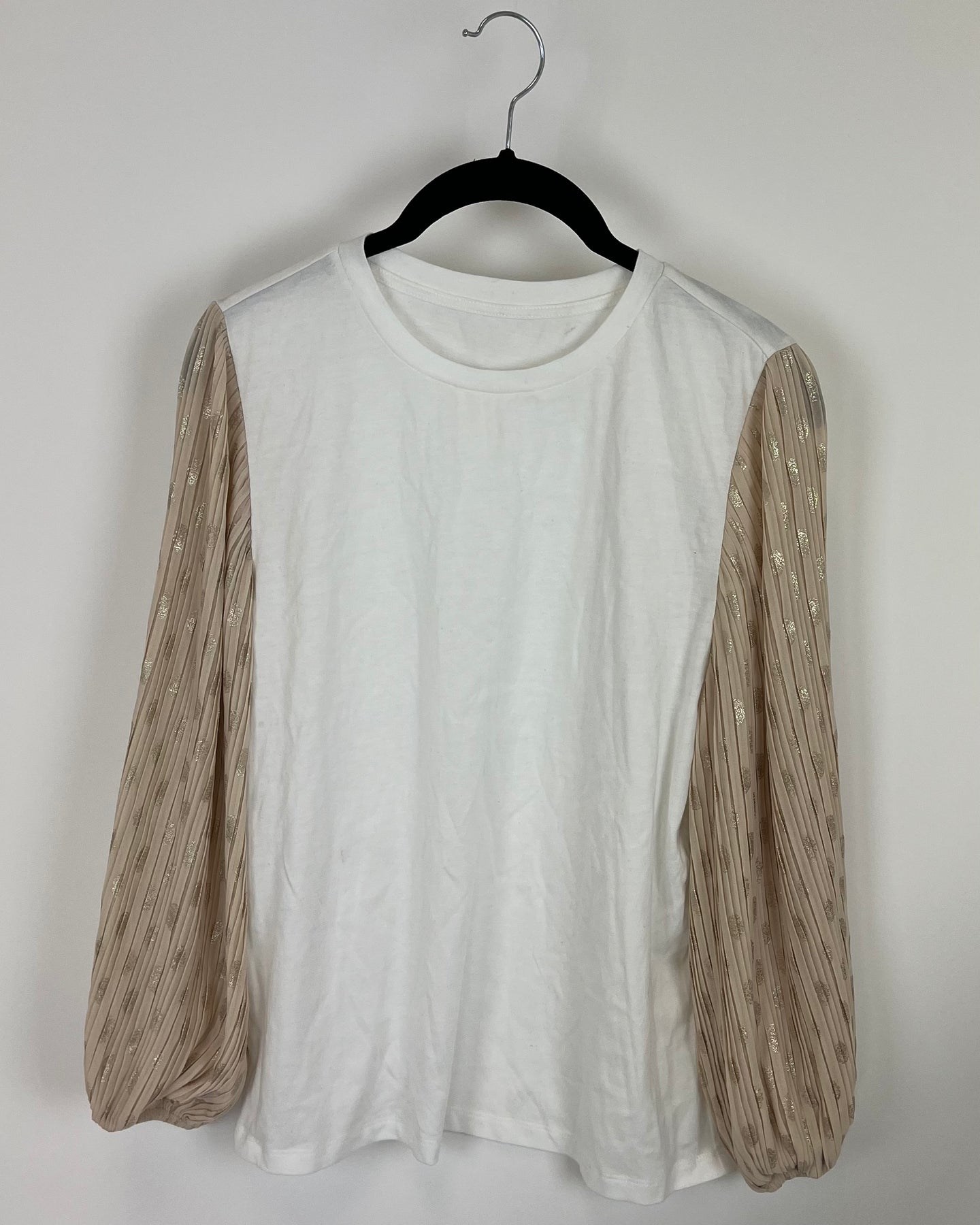 White u-neck long sleeve nude, sheer bell sleeves with gold polka dots.